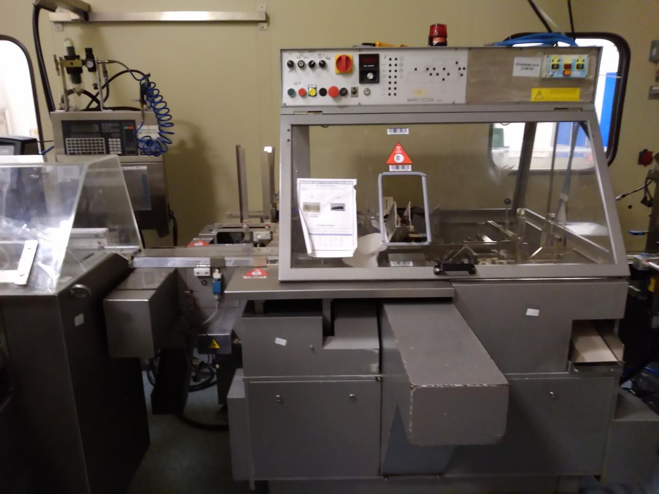 2) d'une encartonneuse Marchesini BA50 de 1992 (avec machine de marquage simple tête Videojet)